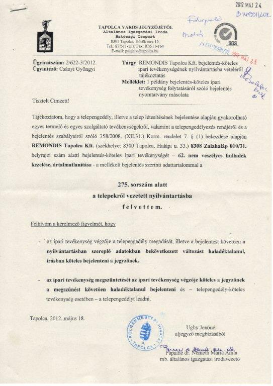 Hrsz. 010/31 Remondis Tapolca Kft. - telepengedély